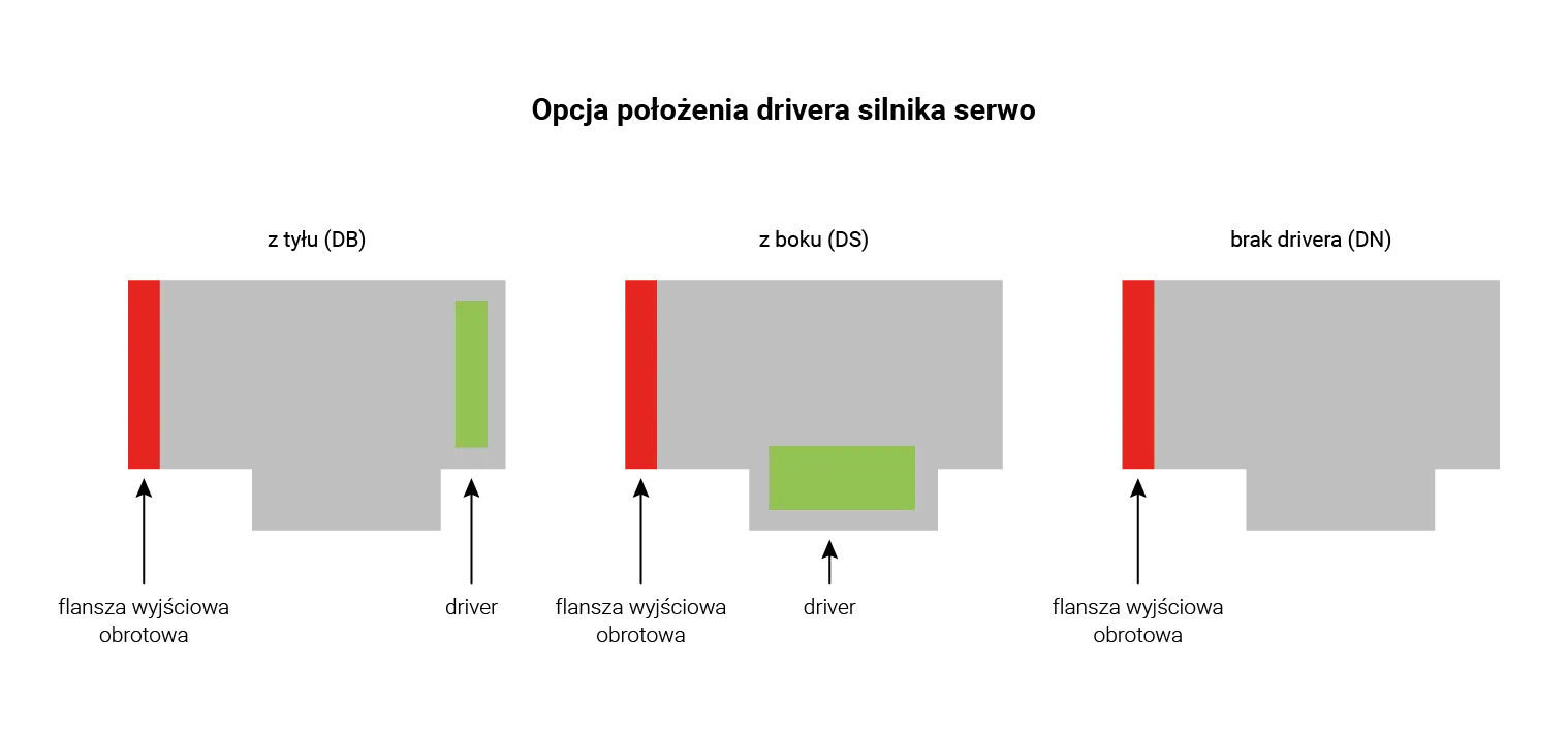Niezależnie od położenia i typu flanszy montażowej można wybrać położenie drivera silnika serwo. Opcjonalnie moduł może nie mieć zamontowanego drivera wewnątrz obudowy. W takim przypadku driver musi się znajdować na zewnątrz modułu.