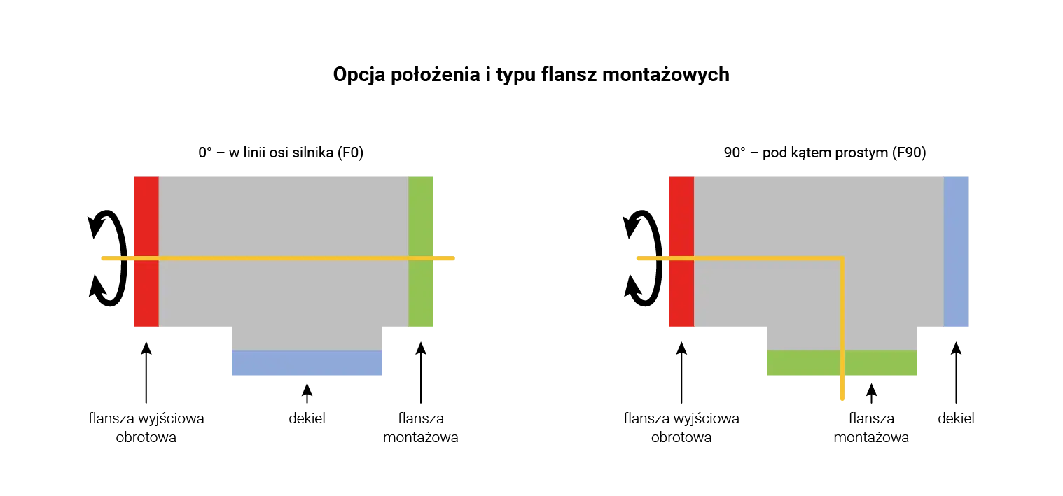 W zależności od budowy łańcucha kinematycznego moduły mogą mieć flaszę montażową (kolor zielony) zamontowaną w linii z osią wirnika (typ F0) lub pod kątem 90 stopni (typ F90). Flansza może być standardowa lub wykonana na zamówienia użytkownika.