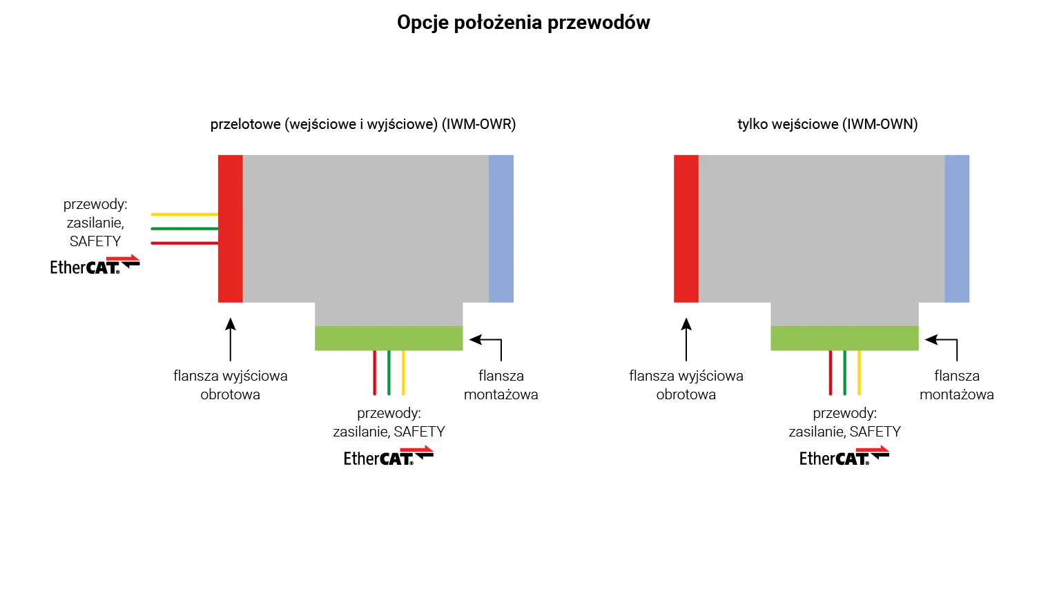 W przypadku, gdy moduł stanowi środek łańcucha kinematycznego, to przewody (wejściowe i wyjściowe) mogą być wyprowadzone od strony flanszy montażowej oraz wyjściowej. Jeżeli do danego modułu nie są dołączone kolejne to przewody wejściowe mogą również być wyprowadzone tylko od strony flanszy montażowej. Przewody mogą również być wyprowadzone z dekli. Pozostałe opcje prowadzenia przewodów wg tabeli kodów oznaczeń. Prosimy o kontakt z naszą obsługa techniczno-handlową w sprawie szczegółów i dostępności opcji.